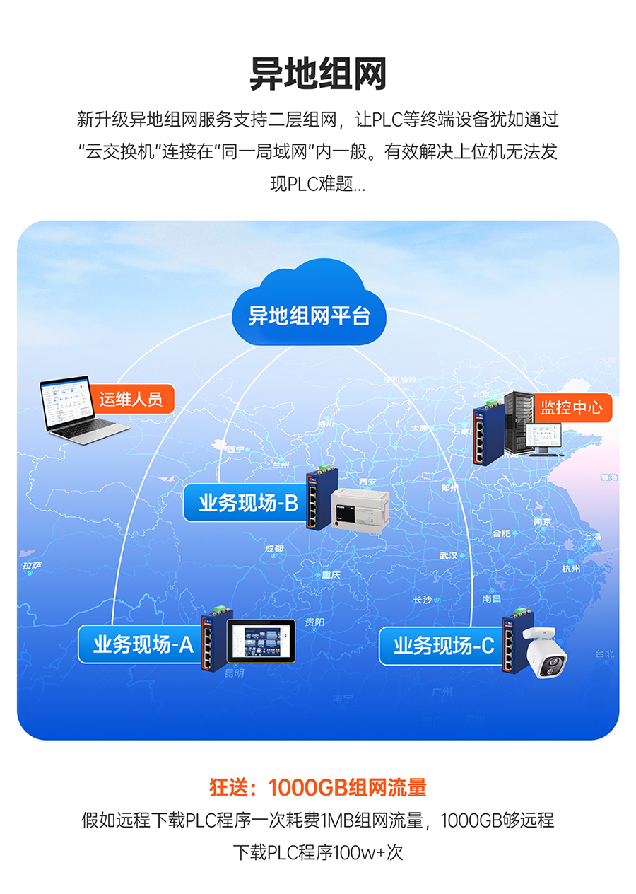 ● 【新异地组网,狂送1000GB流量】新一代SD-WAN技术,让跨区域设备如处同一局域网。豪赠1000GB组网流量,彻底解放远程运维的枷锁!