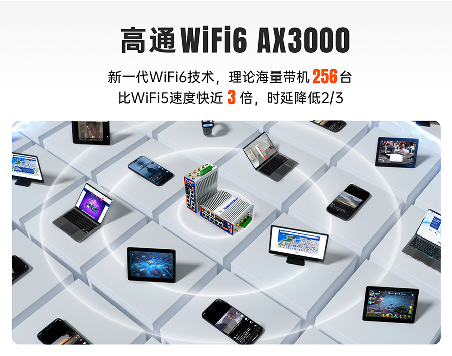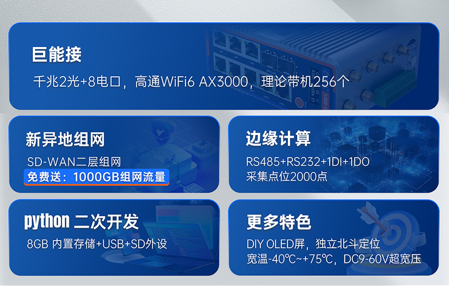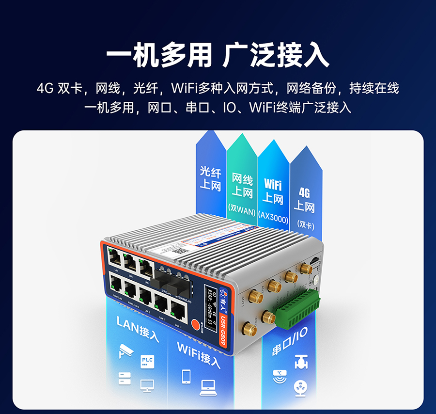 ●【巨能接的“核心枢纽”】千兆2光+8电口+双串口+IO端子:PLC/摄像头/传感器一机接入;4G双卡+高通WiFi6 AX3000,理论带机256个!