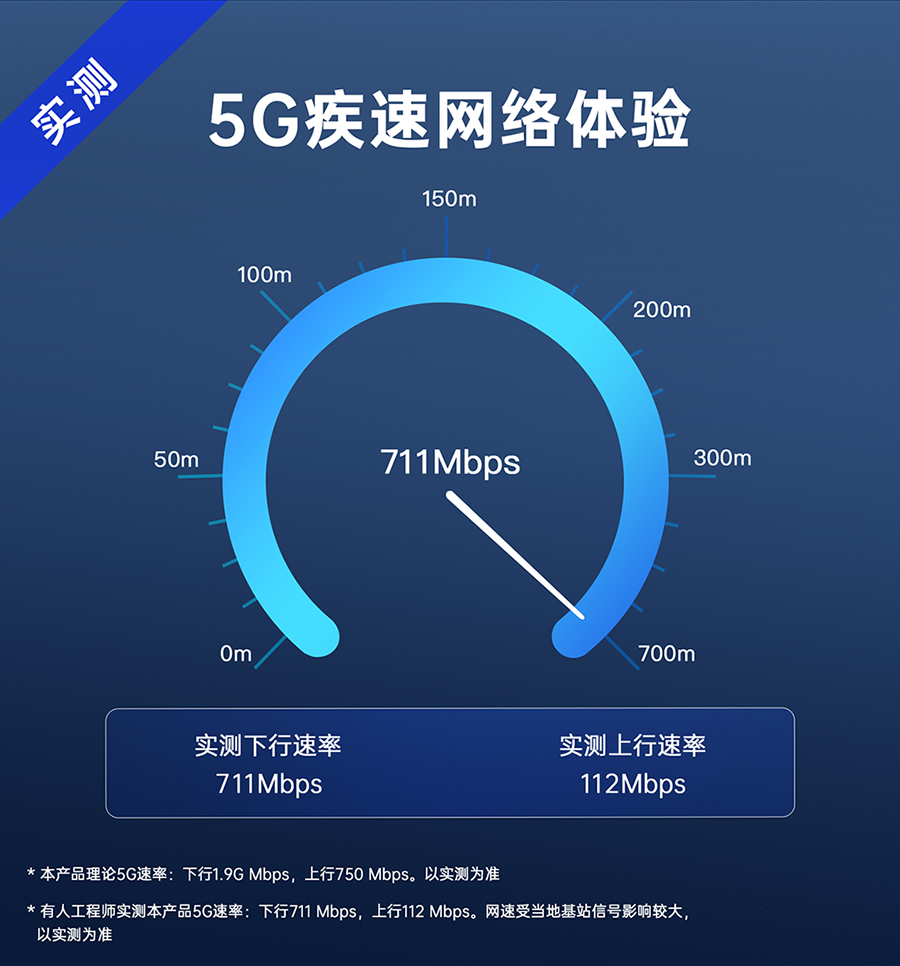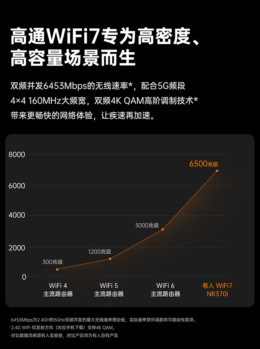 整机WiFi接入速率约达6500Mbps,配合5G频段4x4 160MHz大频宽,复杂场景也能体验满格疾速
