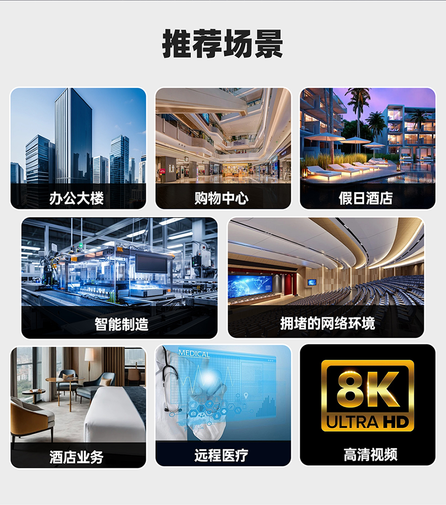 办公大楼、智能制造、购物中心、远程医疗、高清视频等高密度、高容量