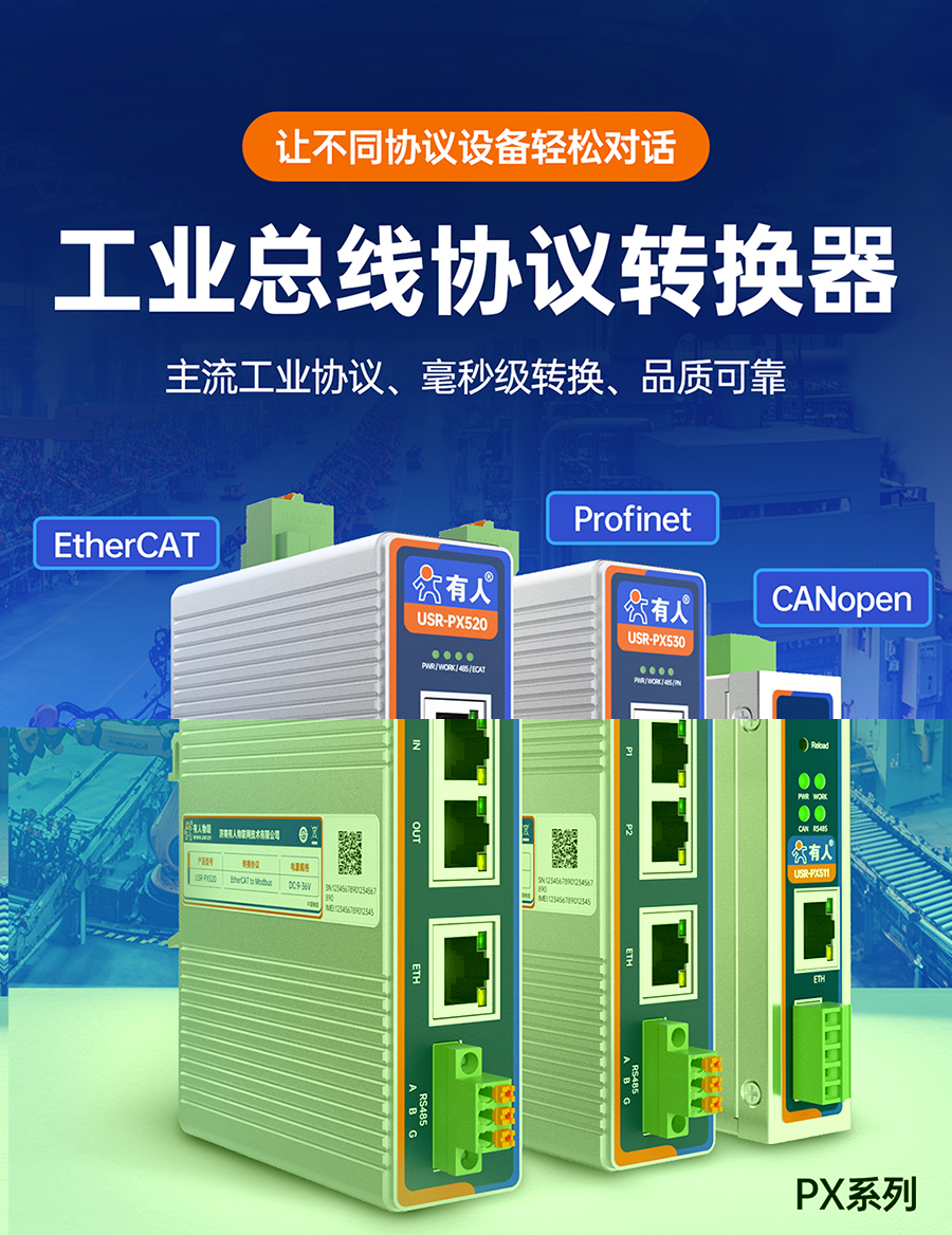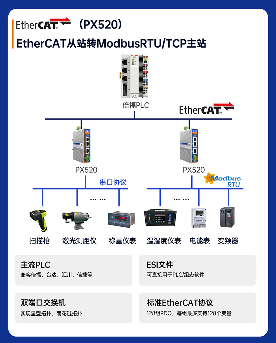 2路*EtherCAT,10/100 Mbps自适应,集成交换机功能