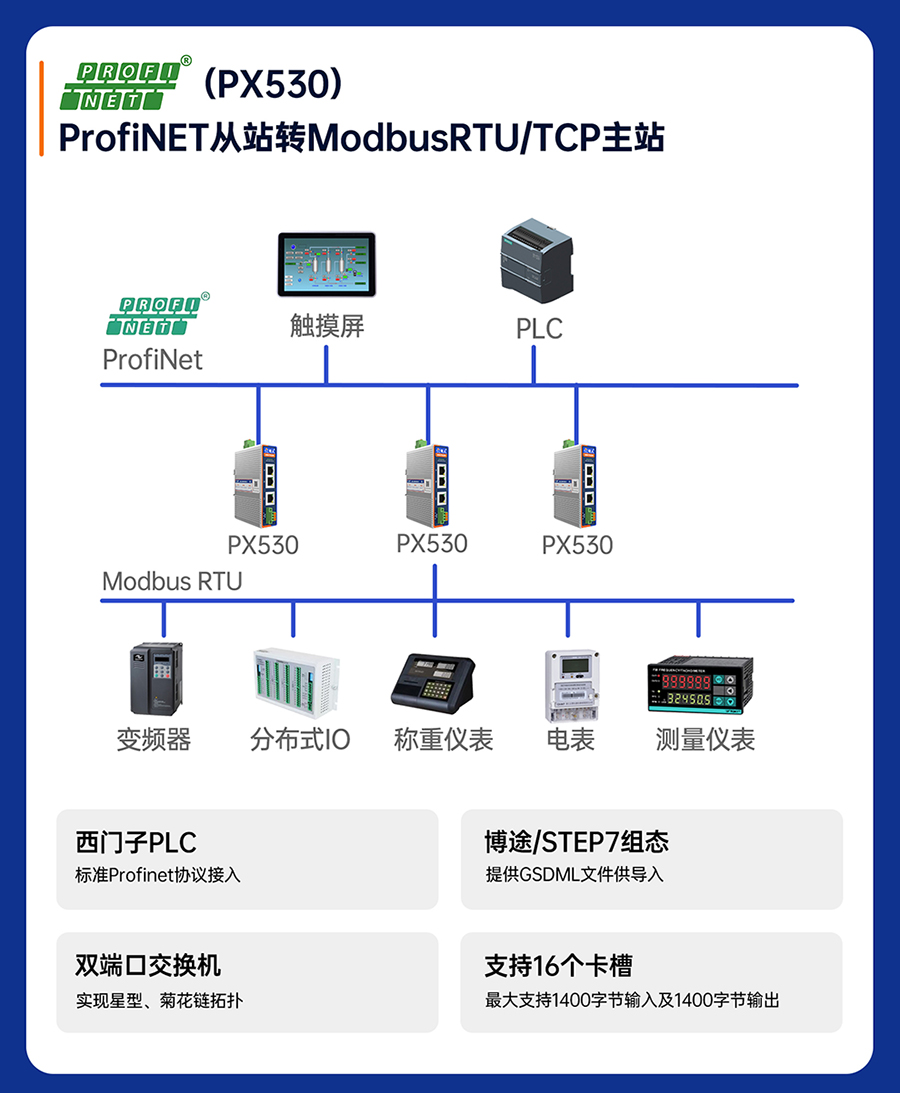 在ProfiNET侧.支持16个卡槽,最大支持1400字节输入及1400字节输出; 在Modbus侧,支持自定义从机和点表信息,最大2000个数据点,并支持加减乘数运算