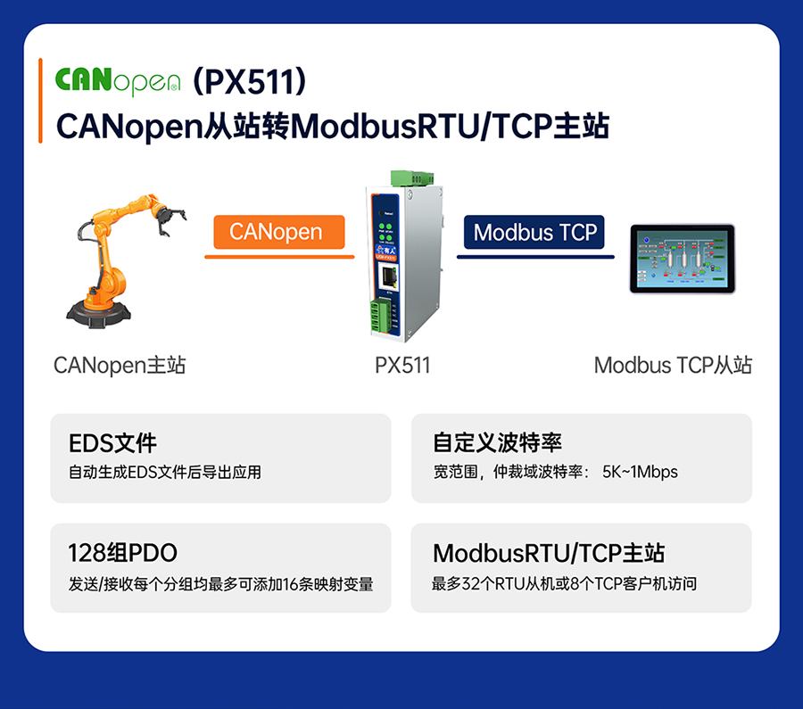 在CANopen侧,支持128组TPDO和RPDO,每个分组最多可添加16条映射变量;在 Modbus侧,支持自定义点表信息,最大2000个数据点