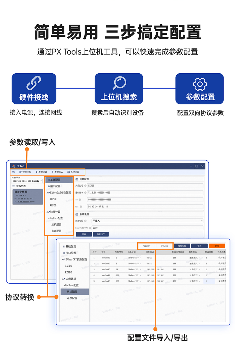 在EtherCAT侧,支持128组RXPDO和TXPDO,每个分组支持128个变量; 在Modbus侧,支持自定义从机和点表信息,最大2000个数据点,并支持加减乘数运算