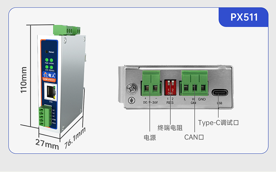110*27*76.1mm(L*W*H) (PX511,含端子和导轨)